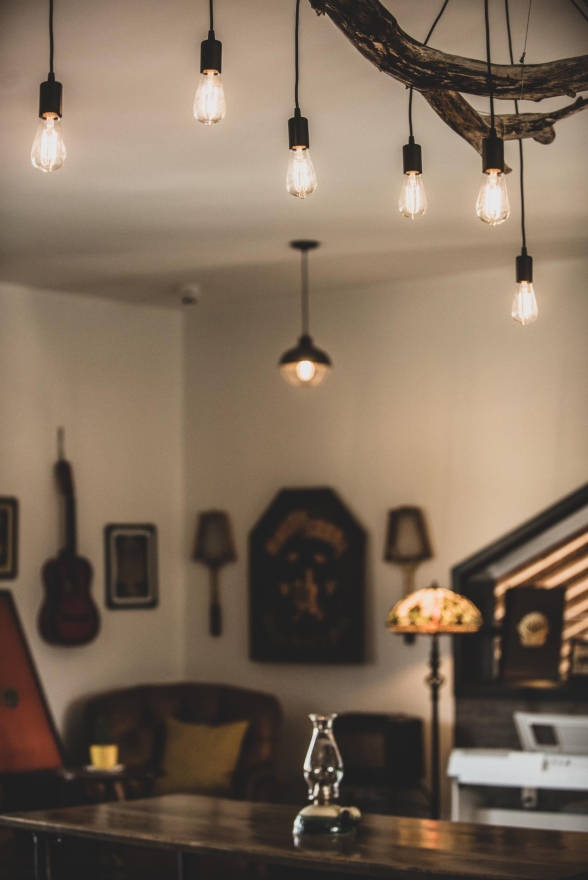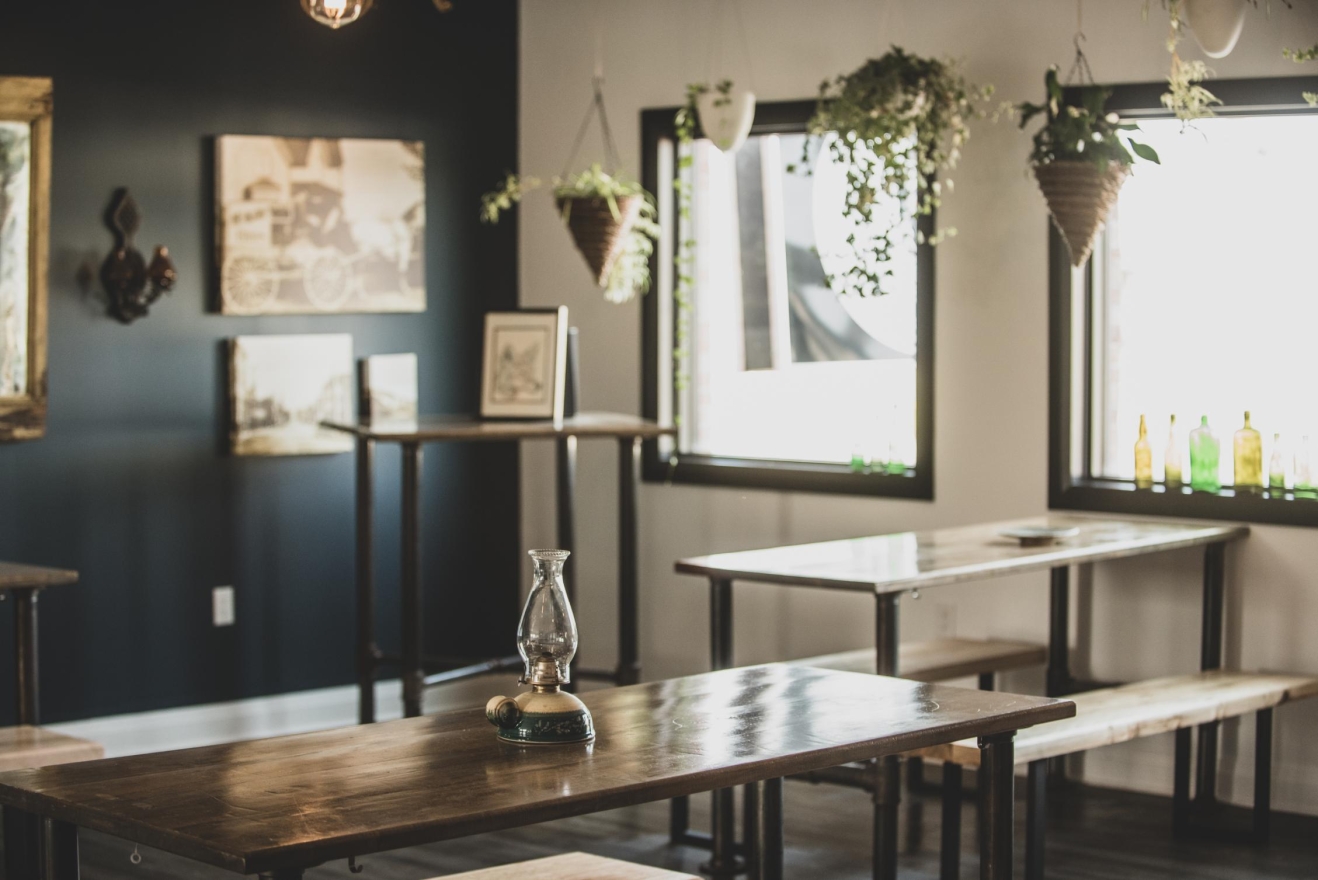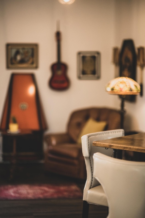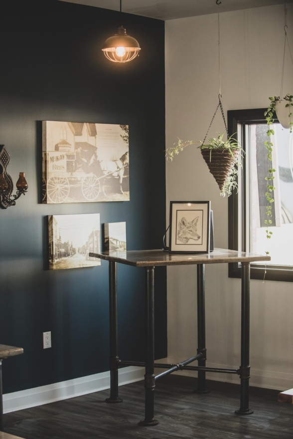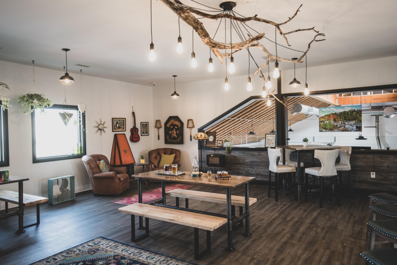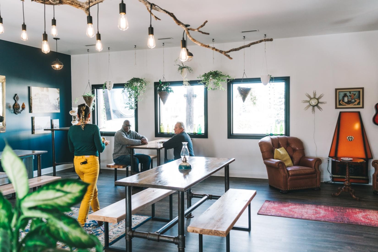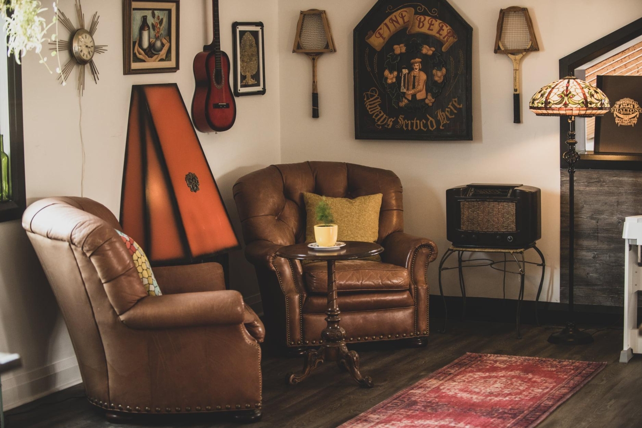 Cozy corners featured leather armchairs, a retro fireplace, and vintage art, inviting relaxation, while a vintage record player encouraged nostalgia. Indoor plants added a natural touch, and a rustic wooden bar offered additional seating. Unique details, like a wall-mounted vintage bicycle honoring the community’s ‘Chicken Man,’ and floating art of Georgetown's Barber Mill, created visual interest.