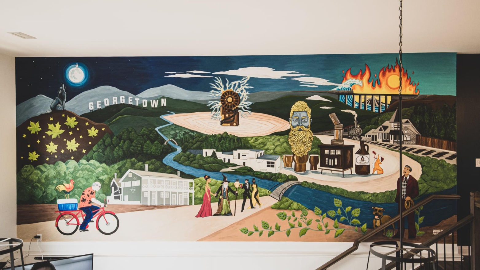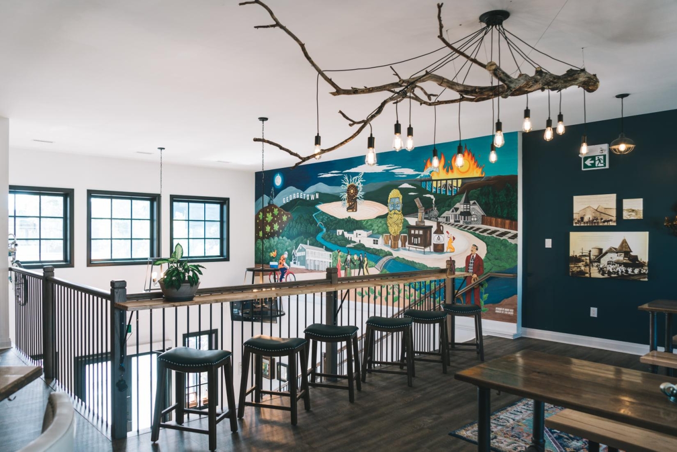 The upstairs taproom at Furnace Room Brewery has become a beloved gathering spot for locals to socialize and enjoy a pint. The design brief called for a rustic yet tasteful space rich in character. Key features included a 60-foot wall mural showcasing iconic beer brand characters, antique Spanish sconces, and a custom driftwood light fixture. A rustic mirror replaced an oversized TV to reflect light and enhance the space, while historic canvas prints celebrated Georgetown's heritage.